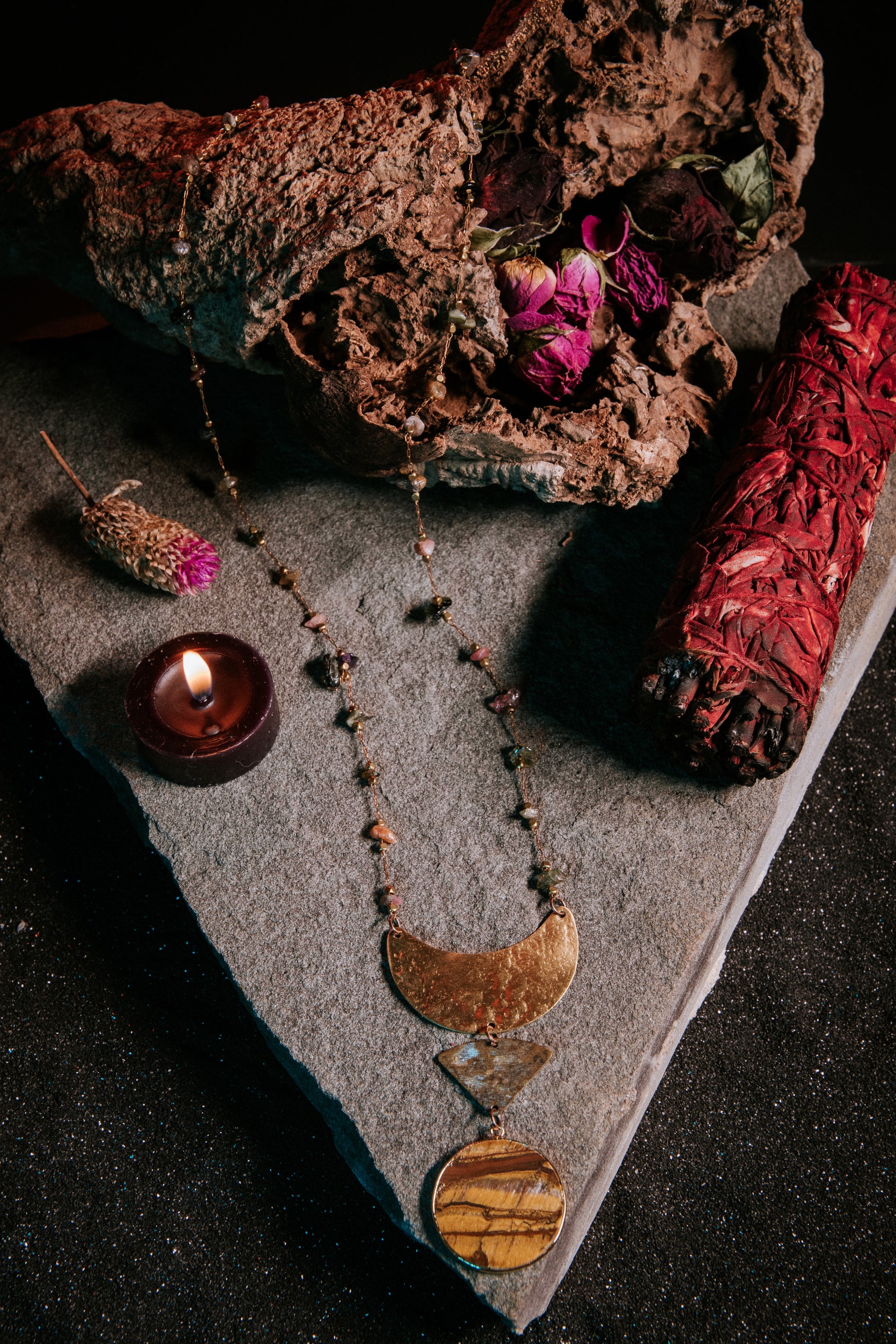 Golden Veil embodies grounded radiance - sunlight filtered through ancient stone. The Tiger’s Eye center holds quiet strength and protection, while hammered brass and copper mirror celestial balance. A talisman for clarity, power, and calm beneath the surface.