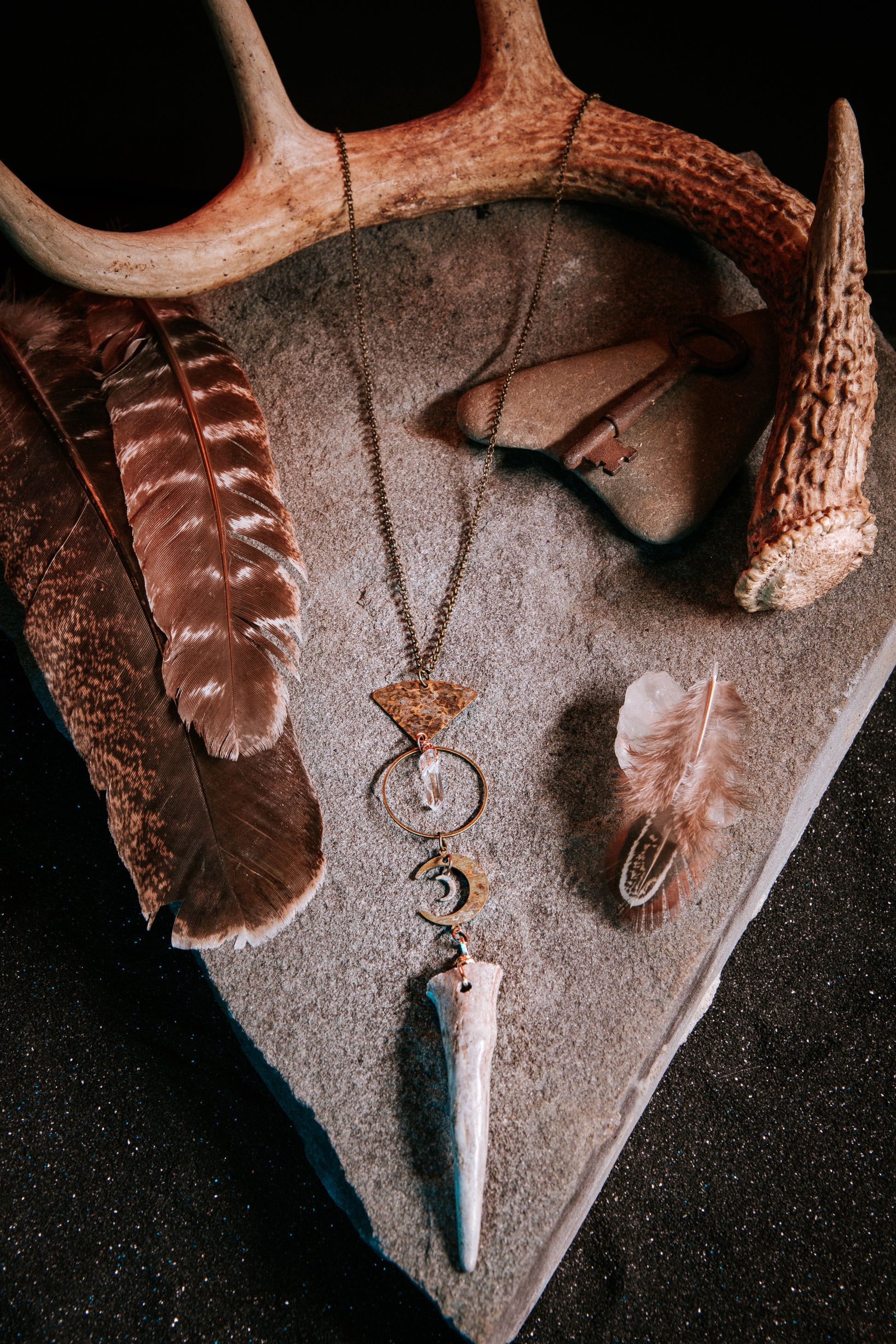 Mystic and primal, Moonclave draws its power from ancient rites beneath a crescent sky. The bone fang anchors its form, balanced by raw quartz and hammered brass - a talisman of intuition, clarity, and quiet strength.