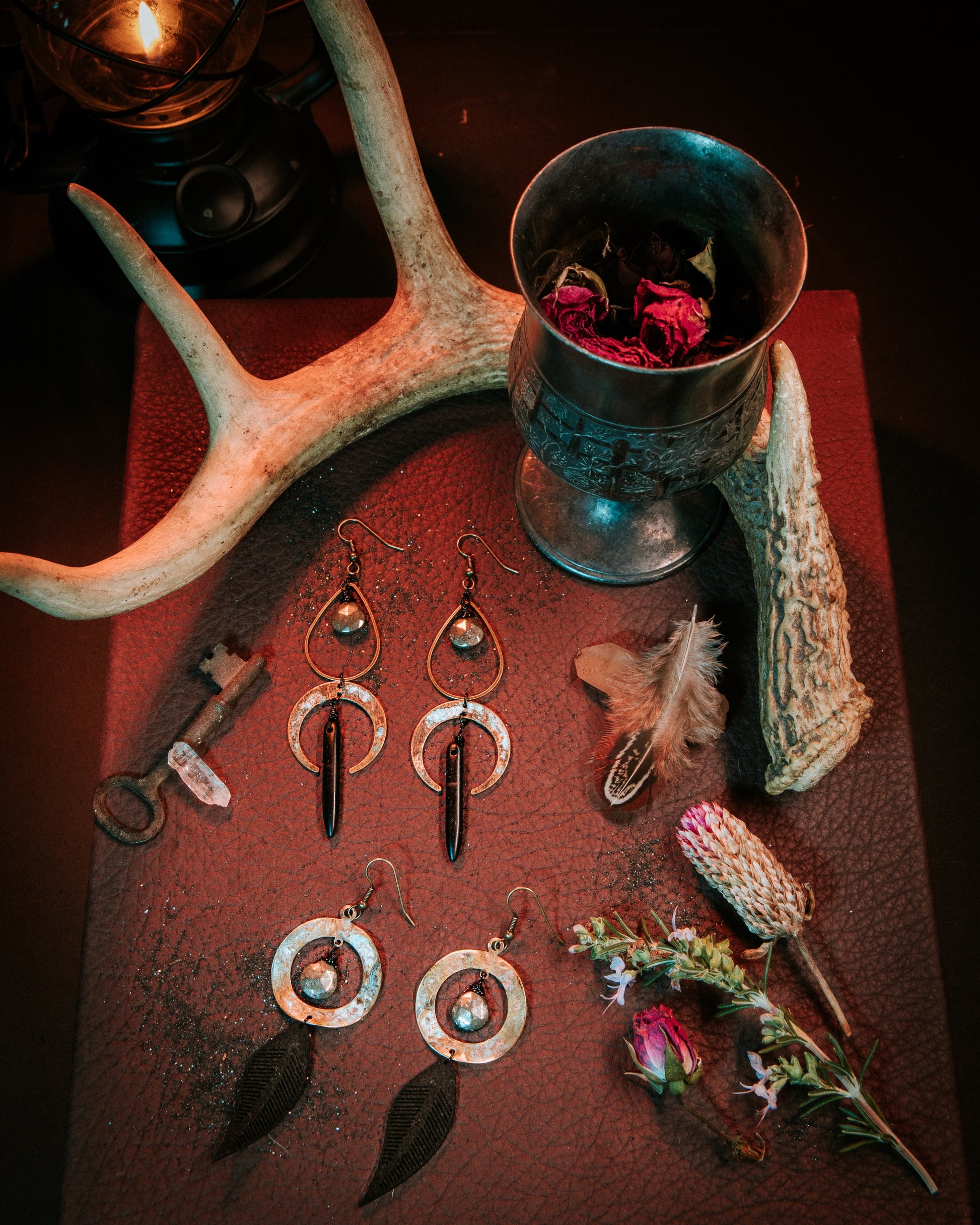 Pictured up top. A balance of shadow and shimmer, Ravenveil earrings carry the energy of flight through darkness. Hammered copper crescents and drops of golden pyrite catch the light like embers, while sleek black howlite anchors the design. A protective adornment for those who walk the in-between.