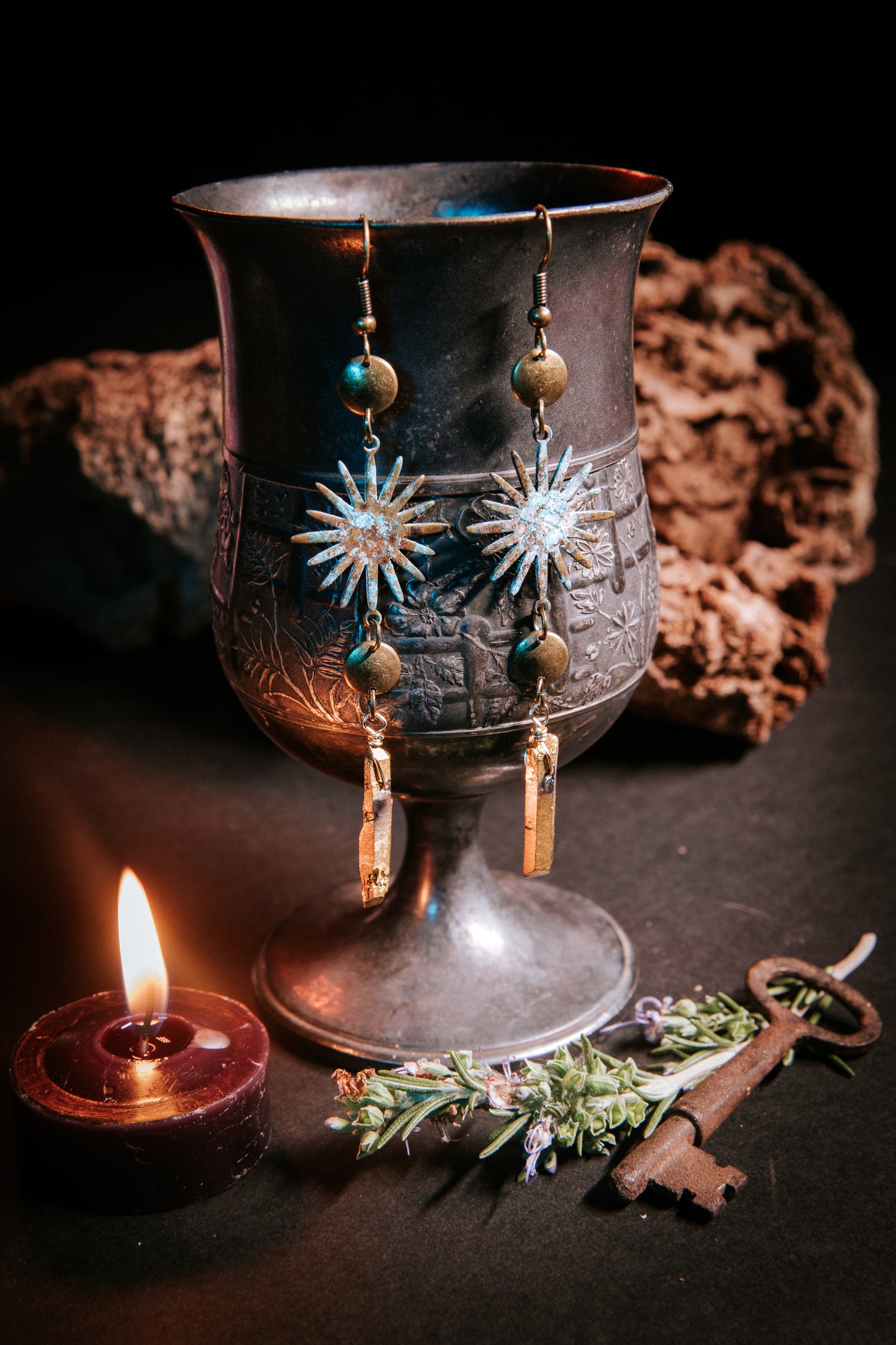 Solaris carries the energy of fire and light — radiant, grounding, and alive. Hand-forged copper suns with a weathered patina reflect resilience through transformation, while raw quartz points channel clarity and strength. A talisman for those who burn bright yet steady.